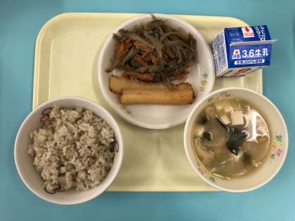 ぬまづ茶飯、イカの照り焼き、きんぴらごぼう、油揚げと豆腐の味噌汁、牛乳でした。