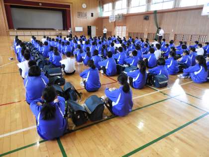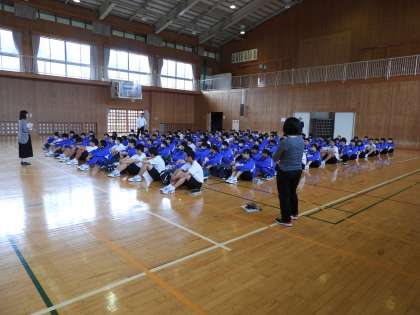 本日、6時間目。修学旅行出発前の最終学年集会を体育館で実施していました。