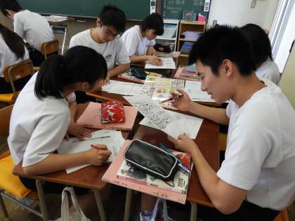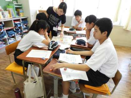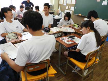 授業風景(3年A組)保健体育です。原小学校の栄養教諭の先生と協力して、栄養のバランスを勉強しています。名倉先生の授業です。