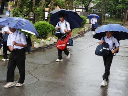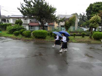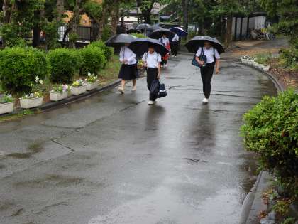 久々の雨の中を登校してきます。中学生は濃い色の地味な傘が多いので、傘の花が咲くという感じにはなりません。