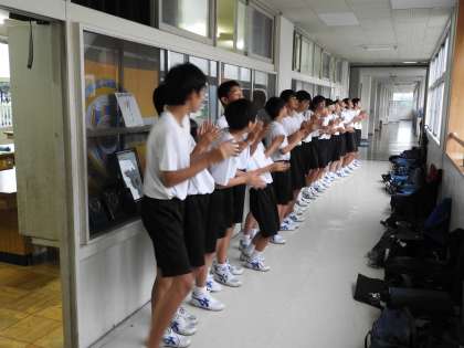 あいにくの雨で、外の部活動は室内で練習中です。ソフトテニス男子の応援の声に誘われて見てきました。