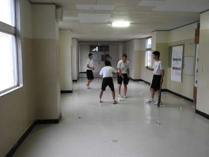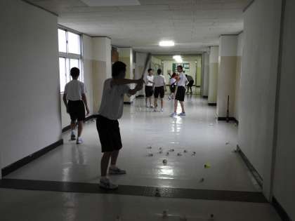 あいにくの雨で、外の部活動は室内で練習中です。ソフトテニス男子の応援の声に誘われて見てきました。