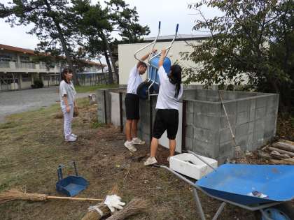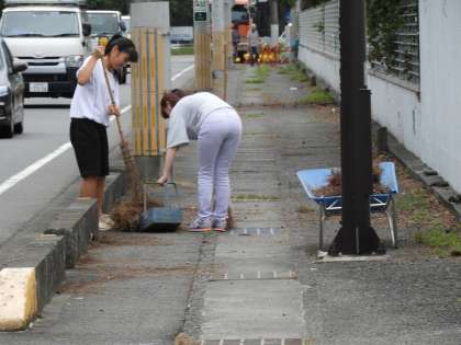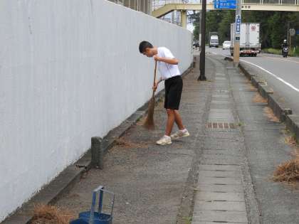 今週1週間、学生ボランティアの竹内さんが学校に来ていろいろとお手伝いしてくれています。今日は校長先生と南門外の歩道のお掃除をしていただきました。3年生が走ってきて手伝ってくれました。うれしかったです。