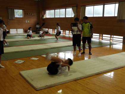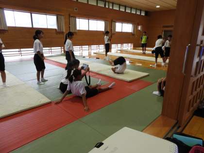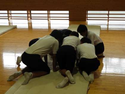 授業風景(1年 体育)です。体育館2階でマット運動をやっていました。iPadを使って演技を撮影し、反省に生かしています。