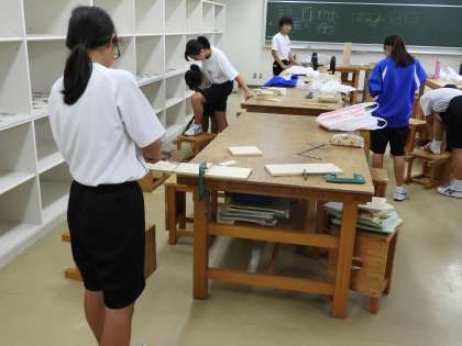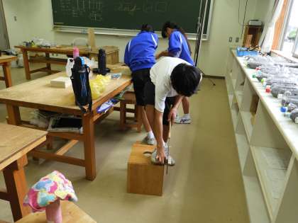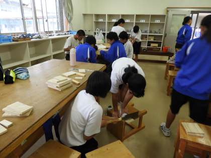のこぎりを使う機会があまりないのではないのでしょうか。ぎこちない感じで木を切っています。