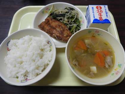ご飯、牛乳、鰯の蒲焼き、もやしと小松菜の炒め物、豚汁でした。