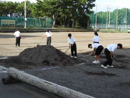 潮騒祭 体育の部 実行委員の活動が朝から始まっています。ライン引きやグランド整備、ご苦労様です。