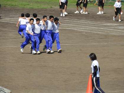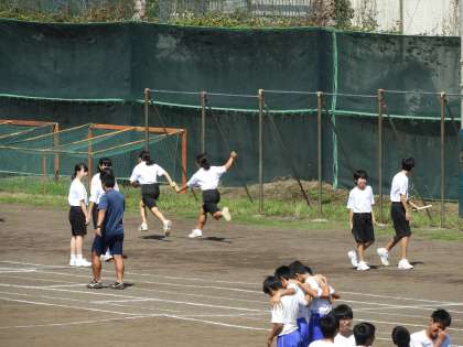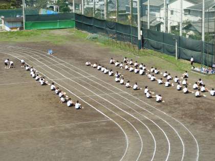 授業風景(1,2年 体育)です。音楽室や南校舎2階から撮影しました。バトン練習や学年種目の練習に励んでいます。