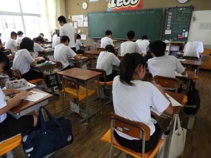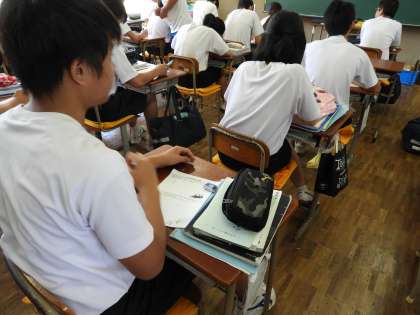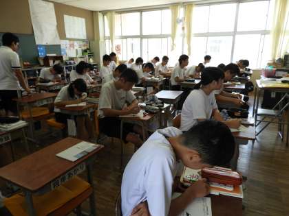 授業風景(3年A組 数学)です。2次関数を生活場面において使える問題に取り組んでいました。