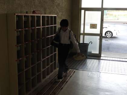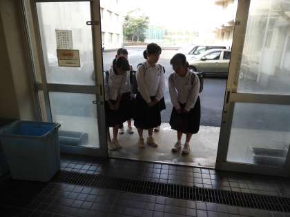 今朝は夜半の雨が上がり、ひんやりとした気温の朝になりました。挨拶運動を始めました。いつも早く来る人が撮影できていないので、はじめに生徒玄関で挨拶を交わしました。
