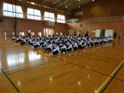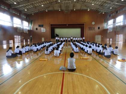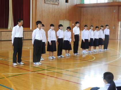 今朝、1年生の学年集会がありました。体育館に向かうと、後期の二役が、抱負を述べていました。