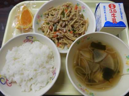 ご飯、牛乳、青椒肉絲、中華スープ、チルドオレンジでした。