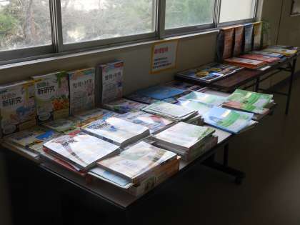 2年部では、3年の進路学習のために取り組む「学習ノート」を個々の力にあわせて取り組めるように、個人選択制にしました。いろいろな会社のテキストが展示されています。