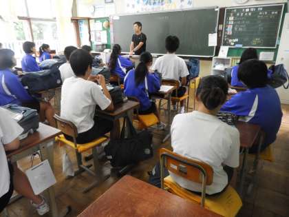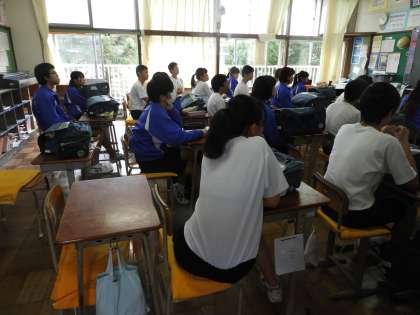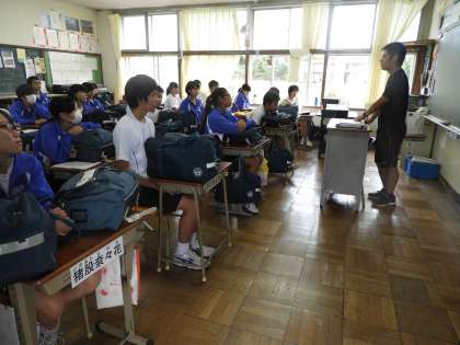 学級活動(3年D組)です。先生から、今後についての話を聞いています。