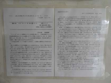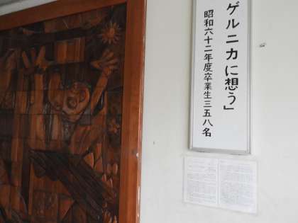 「ゲルニカに想う」の木版画の件は以前、掲載しましたが、いきさつがわかった原稿を掲示しました。62年度卒業の古根村さんからいただいたものです。学校へお出かけの際に、北校舎東の通路に張りましたので、ご覧ください。きっと記憶がよみがえるのではないでしょうか。