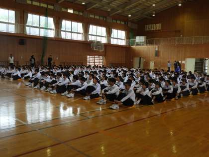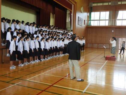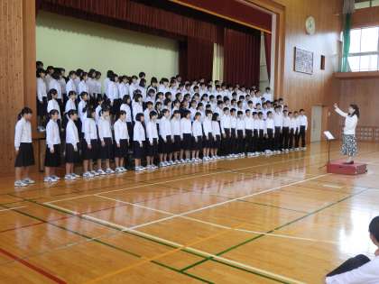 本日の朝礼は、二役の任命ですが、その前に連合音楽会に明日、出場する3年生の合唱を披露してもらいました。