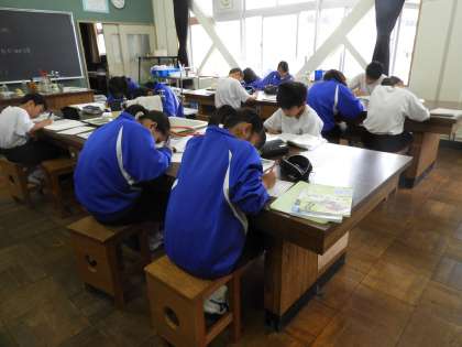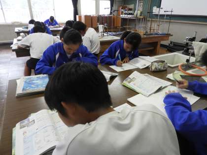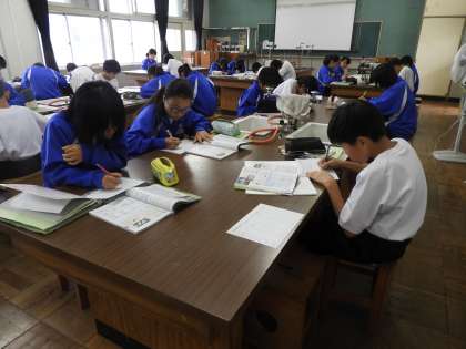 授業風景(1年C組 理科)です。プリントまとめをしていました。先生が職員室へ何かを取りにいったようですが、先生がいなくても、黙々とまとめに取り組んでいました。