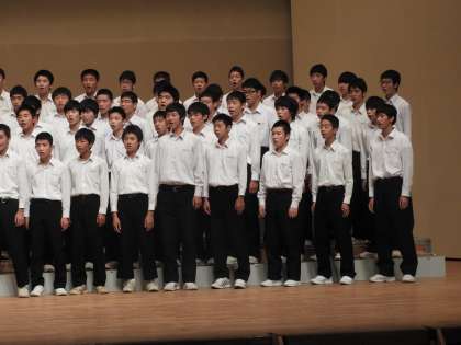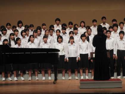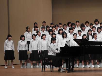 原中学校の1曲目は、「サクラ色」です。2曲目は「名付けられた葉 混声四部合唱」です。かなり歌い込んできたので、完成度も増していました。きれいなハーモニーが会場に響き、今までで一番のできだったと思います。