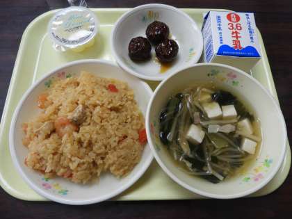 ナシゴレン、牛乳、ひじき入りつくね、春雨スープ、リンゴゼリーでした。
