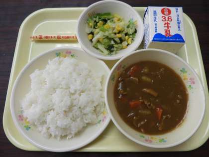 ご飯、牛乳、カレーライス、コーンと野菜のソテー、スティックチーズでした。