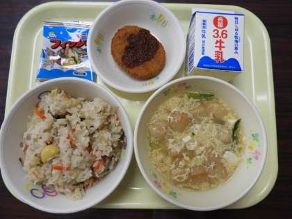 奥久慈ご飯、牛乳、大豆コロッケ、麩と卵の汁物、アーモンド小魚でした。