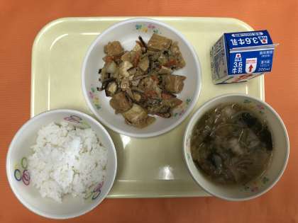 ジャーチャン豆腐、ワンタンスープ、ご飯、牛乳 です。