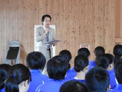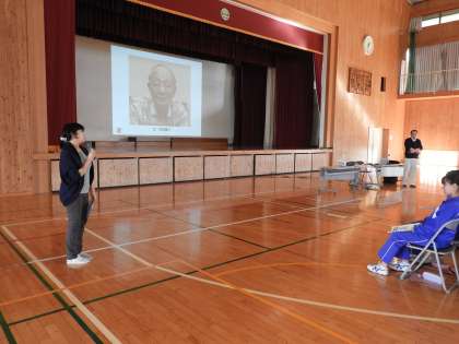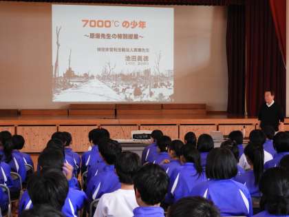 本日5・6時間目に、2年生の平和学習が体育館で行われました。来年の修学旅行で広島へ行くことが決まっている2年生は、1年の頃から平和学習を継続しています。今日は原爆先生で知られている、池田眞徳先生に来ていただきました。
