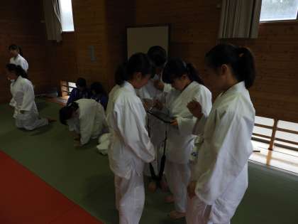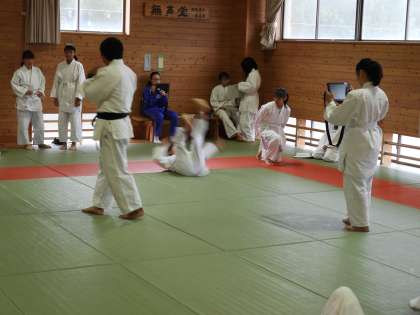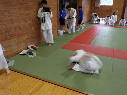 柔道の前回り受け身の練習ですが。自分の姿をタブレットで撮影してもらい、改善点を確認し合う授業です。