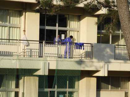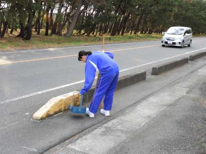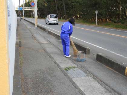 6時間目が終了後の月、水、金に清掃活動があります。今日は、校長室の掃除の生徒に南門前の落ち葉をはいてもらいました。ベランダ掃除の生徒も撮影しました。