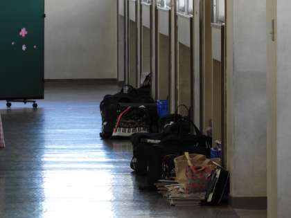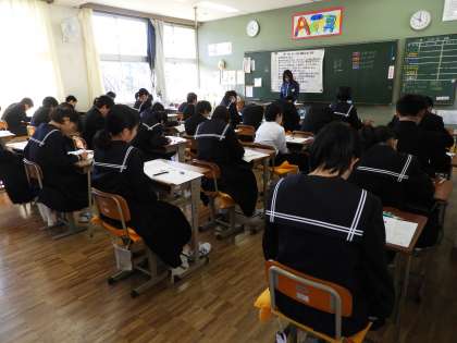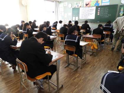朝、回れなかった2年生の教室へ行ってきました。第4ステージテストに取組中の2年A,B組の生徒たちです。廊下の鞄もそろっています。