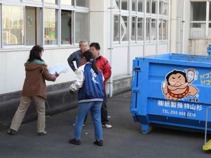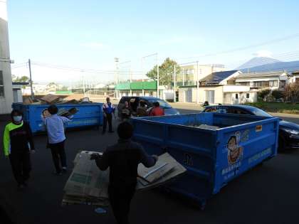 PTA役員さんと先生方で、学校分の古紙をコンテナを入れ始めました。