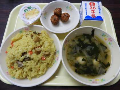 キノコとウインナーのカレーピラフ、牛乳、レバー入り肉団子、ウズラ卵と野菜スープ、梨ゼリーでした。
