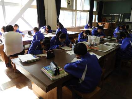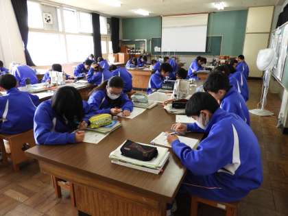 授業風景(1年C組 理科)です。光の屈折を以前、勉強していました。今日はそのテストのようです。うまくかけるかな?