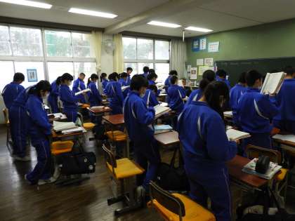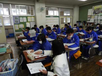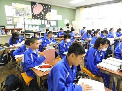 授業風景(1年B組 英語)です。英文を一斉に音読していました。今度は、立ち上がって暗唱するようです。