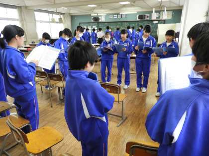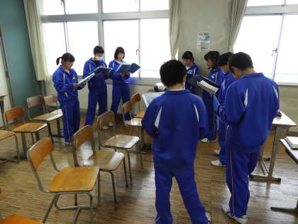 授業風景(1年A組 音楽)です。1Aは音楽室にいました。「奏」というスキマスイッチの楽曲を合唱にアレンジしたものを練習していました。どんな仕上がりになるか、今から楽しみです。
