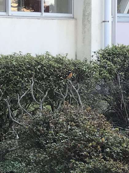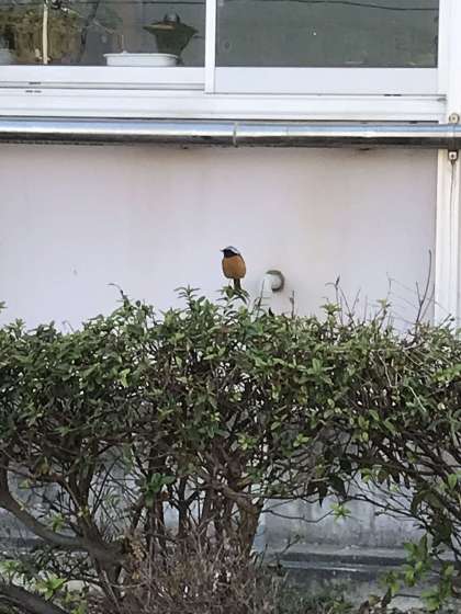 きれいな小鳥が飛来しました。日中、北門の花壇に花を植えていますと、目の前のツツジの木に小鳥が止まりました。逃げないようにそっと撮影しました。しばらく、そばを飛び回り、目を楽しませてくれました。
