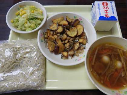 中華麺、牛乳、五目ラーメン、サツマイモと小魚の唐揚げ、ボイルドサラダでした。