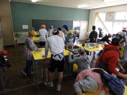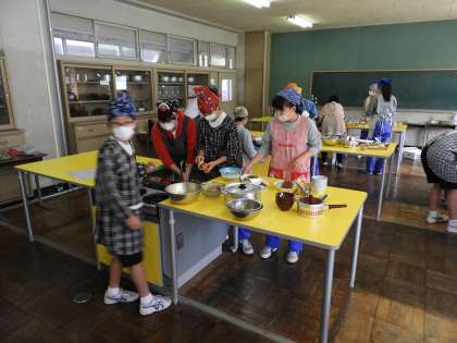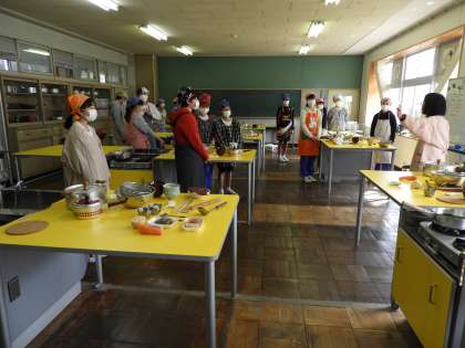 授業風景(2年D組 家庭科)ビフォーです。今日は2Dが調理実習です。先生に話をしっかりと聞いて、スタートです。