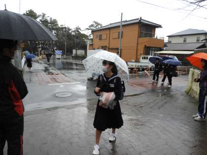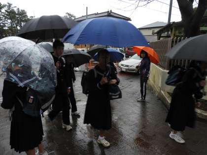 雨は徐々に小やみになってきました。傘を差さずに登校する生徒が増えてきました。