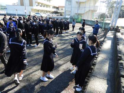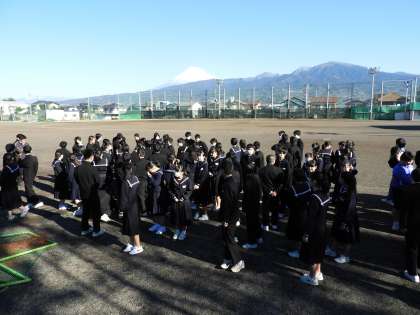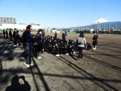記念植樹(3年)を1時間目に行いました。かねてより校庭の花壇や雨樋に自生していた松の苗木を集めて鉢に移植しておきました。3年生の卒業記念に木を植えられそうな南門周辺に、記念植樹をお願いしました。運動場に集まったときにはきれいな富士山が顔を出してくれていました。