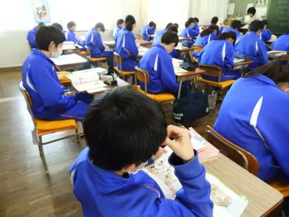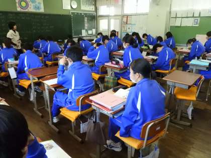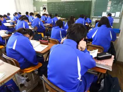 授業風景(1年A組 英語)です。ヒアリングをやっていました。今時の録音は、効果音も入っていて、昔の録音とは大違いです。