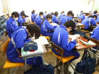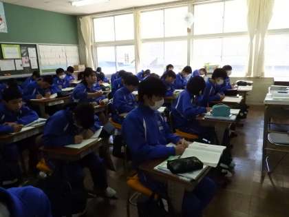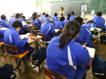 授業風景(1年D組 国語)です。故事成語を勉強中でした。五十歩百歩の漢文を先生が板書したところ、生徒たちは「難しい!テスト出るの−」と聞いていました。