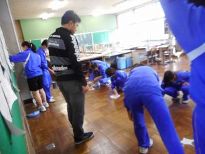 本日、各学級教室、調理室、被服室のワックスがけを行いました。各学級、整備委員とボランティアの生徒で活動しました。自分たちが日頃使っている場所を、自分たちできれいにすることで、床も心も磨かれていきます。是非、きれいな教室がずっと続くことを意識して過ごしていきましょう。