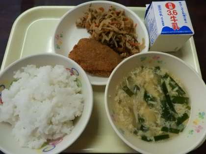 ご飯、牛乳、黒はんぺんチーズフライ、切り干し大根の煮物、ニラ玉汁でした。