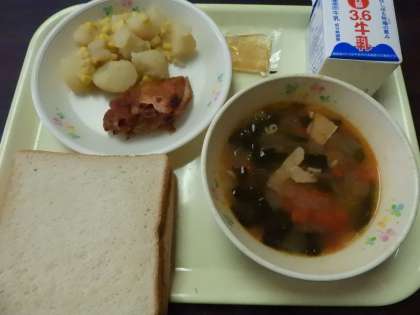 食パン、牛乳、タンドリーチキン、ポテトとコーンの洋風煮、ミネストローネ、リンゴジャムでした。