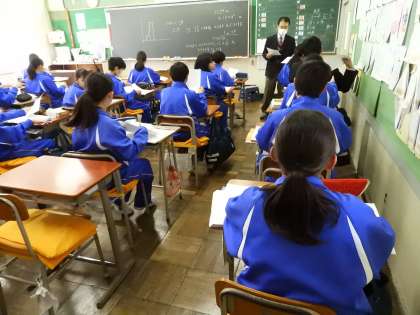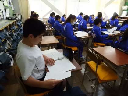 授業風景(1年C組 数学)です。1Cも数学でした。こちらはヒストグラムという言葉を使っていました。プリントで統計の問題を解決する個人学習に入りました。