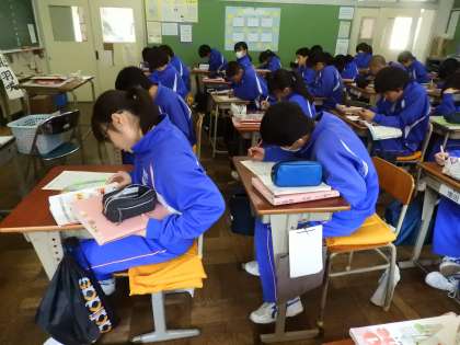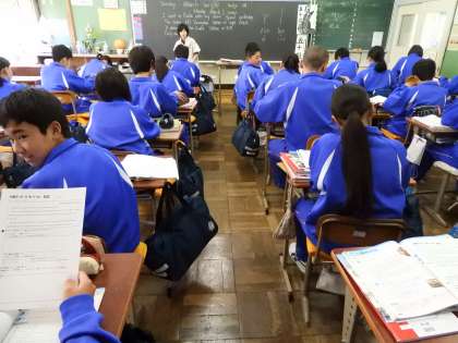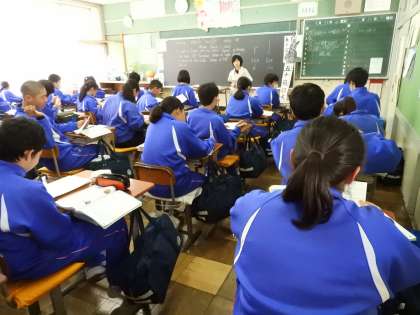 授業風景(1年D組 英語)です。日記の英文を読んでいました。昔に比べ、教科書もバラエティーに富んでいます。