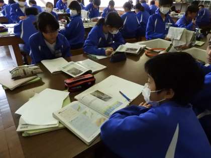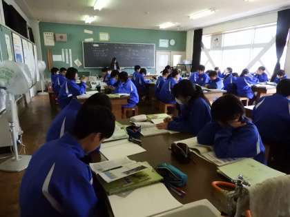 授業風景(1年A組 理解)です。1Aは理科室にいました。教科書で、地形のなりたちのような所を学習していましたが、プレートという言葉に目がとまりました。昨日は、東日本大震災から8年目でした。2時46分に、全員で黙祷を捧げました。