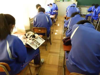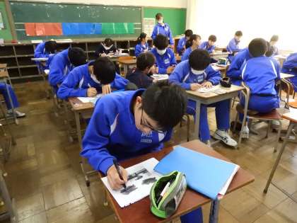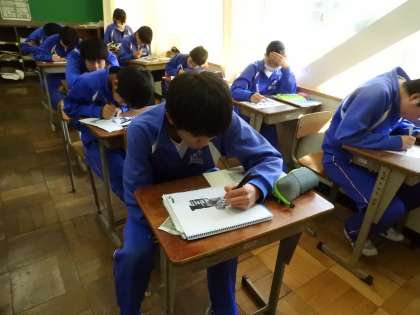 授業風景(2年D組 美術)です。点描画をやっていましたが、売り物になりそうなくらい、いい作品がたくさんできていました。