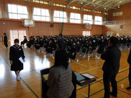 午前中、体育館に向かうと、3年生が卒業式の練習をしていました。だいぶ完成に近づいています。作法があるので、休んでいる生徒も学校に出てきて練習をできるといいなと思います。卒業まで、あと4日です。